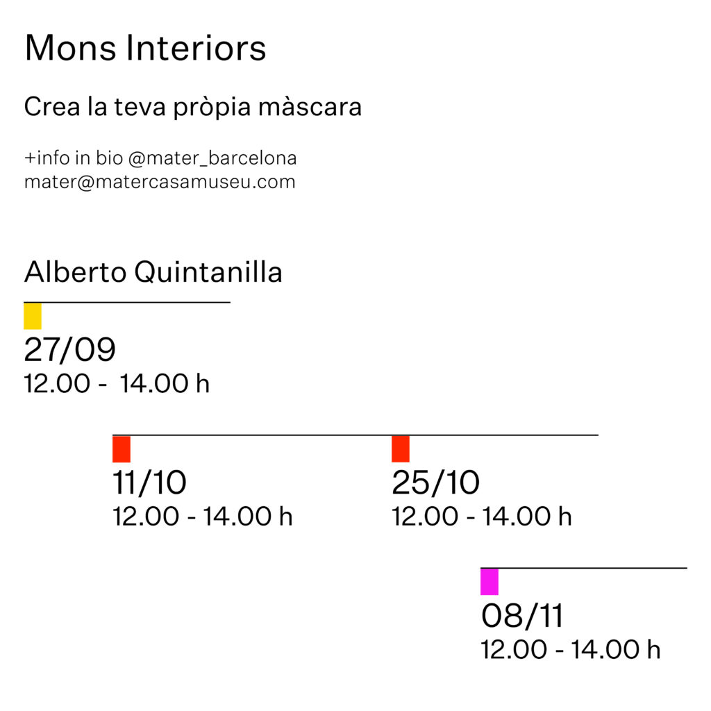 L’activitat del workshop “Crea la teva pròpia màscara” s’emmarca en l’exposició Mons Interiors, referent al protagonista de l’exposició Alberto Quintanilla de la Mar, pintor, gravador i escultor peruà nascut en Cusco en 1934, l’obra del qual ha estat elogiada per Pablo Picasso com “la primera aportació peruana a la pintura universal”. En aquesta experiència creativa, les seves màscares —que evoquen mites andins, rondalles personals i figures fantàstiques inspirades en una tradició ancestral transformada per la seva imaginació— dialogaran directament amb l’imaginari migrant i simbòlic de l’exposició.